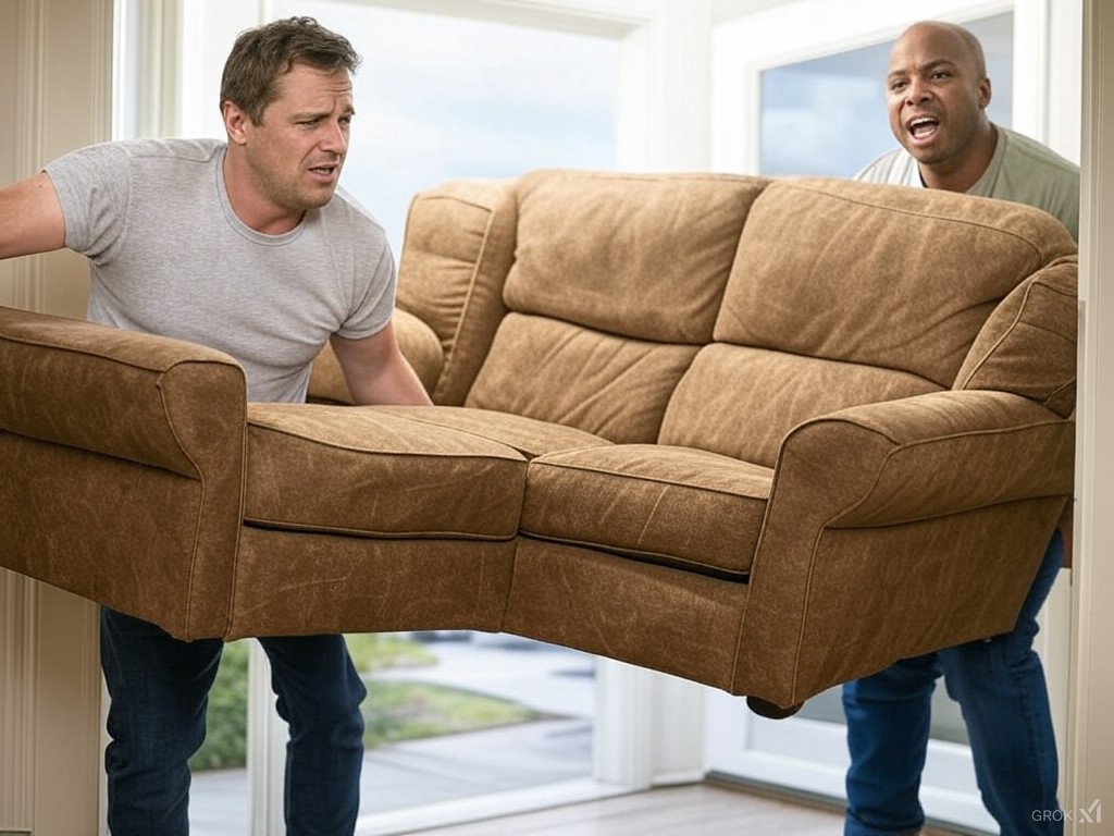 After about twenty minutes of vigorous pushing and maneuvering, the guy pants, “I think we’ll have to call it a day. There’s no way we’re getting it inside.”