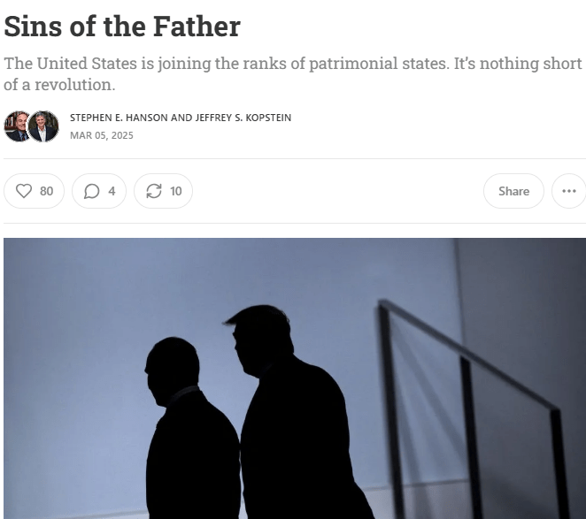 Finally, Hansen and Kopstein, the political scientists Rauch’s article works from, also have a piece in Persuasion. Their focus is on how the shift back to patrimonialism is revolutionary.